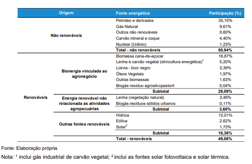 A análise no estudo teve como base empírica os dados disponibilizados pelo Balanço Energético Nacional (BEN), principal instrumento oficial de monitoramento da evolução da matriz energética brasileira. Além disso, foram utilizadas base de dados da Organização das Nações Unidas para a Alimentação e Agricultura (FAO), do Instituto Brasileiro de Geografia e Estatística (IBGE), Empresa de Pesquisa Energética (EPE) e as modelagens globais como o GTAP-Power (expansão da base de dados GTAP – Global Trade Analysis Project – com foco na eletricidade).