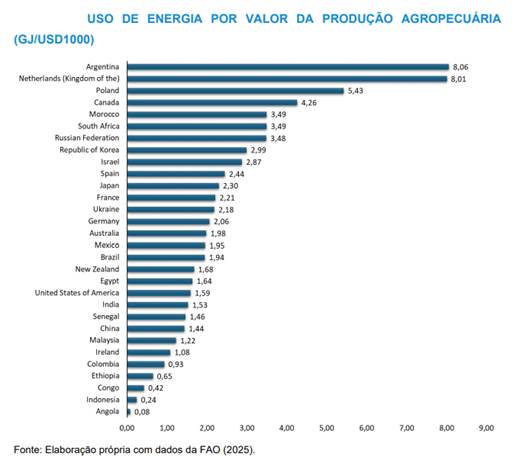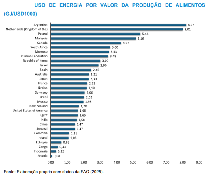 Em 2022, o Brasil apresentou um consumo de 2,0 GJ de energia por mil dólares de valor da produção de alimentos, valor ligeiramente superior à média global (1,7 GJ/USD1000), mas inferior a diversos países produtores relevantes, como: Argentina (8,2 GJ/USD1000); Canadá (4,3 GJ/USD1000); Espanha (2,4 GJ/USD1000); e França (2,2 GJ/USD1000).