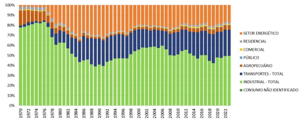 Historicamente, o setor industrial se consolidou como o principal consumidor da bioenergia vinculada ao agronegócio. No início da série, esse setor absorvia mais de 70% da oferta total dessas fontes, tendência que se estabilizou em cerca de 50% nas últimas décadas. Essa dominância reflete a intensa utilização de biomassa sólida (como lenha e carvão vegetal) e de subprodutos industriais (como lixívia) nos processos industriais térmicos, particularmente nos subsetores de alimentos e bebidas, papel e celulose, cerâmica e ferroligas.