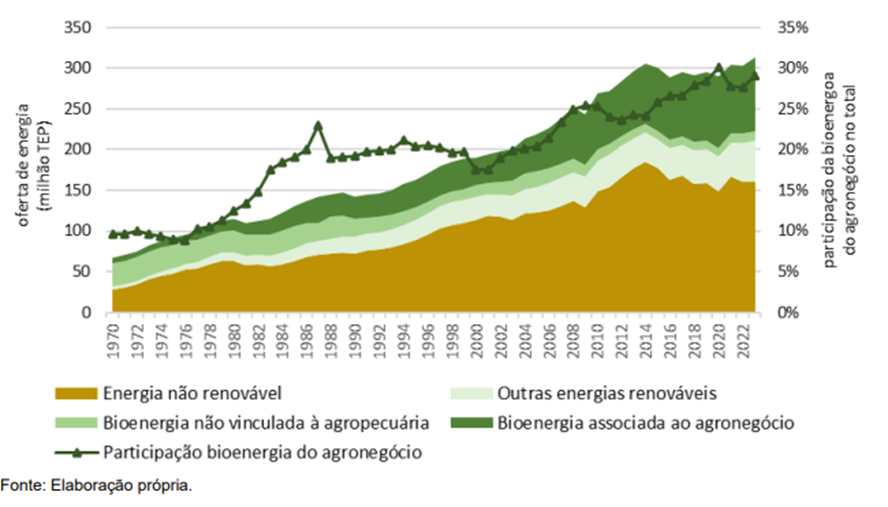 No início dos anos 1970, a contribuição agropecuária à oferta energética apresentava elevada participação da lenha e carvão vegetal, que respondiam por mais de 40% da bioenergia do setor. Essa configuração começou a se alterar a partir dos anos 1980, quando a produção de derivados da biomassa da cana-de-açúcar se intensificou, impulsionada pela implementação do Programa Nacional do Álcool (Proálcool).