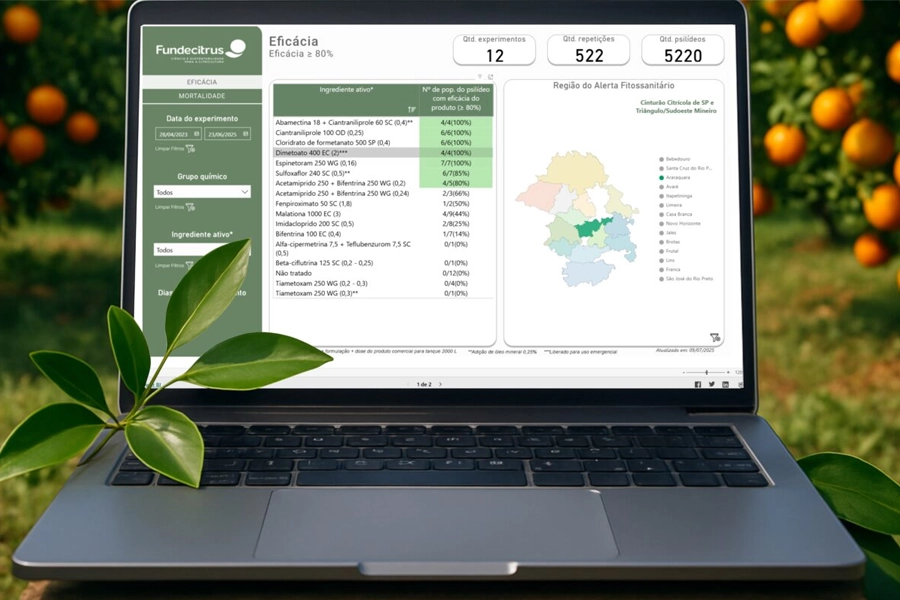 O Fundecitrus disponibilizou, nesta quarta-feira (9), mais uma atualização do Avalia Psilídeo, ferramenta que auxilia o citricultor fornecendo informações sobre a eficácia de inseticidas para o controle do psilídeo.