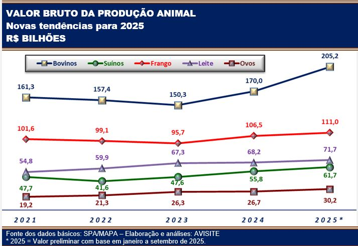 Como sempre, a maior contribuição (perto de 43% do VBP total) vem dos bovinos. Seu VBP deve aumentar quase 21% e superar pela primeira vez os R$200 bilhões. Embora apresentando crescimento bem mais moderado (aumento anual de 4,2%), o frango permanece como segundo maior participante do VBP, respondendo por 23% do valor total.