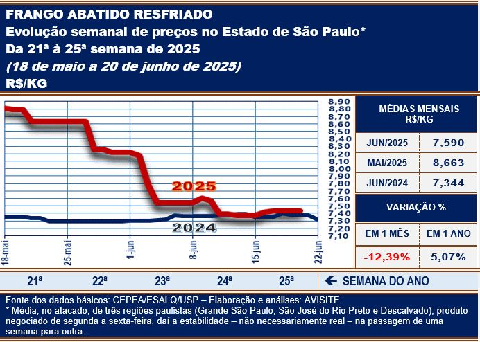 A terceira semana de junho, 25ª do corrente exercício, ao mesmo tempo que trouxe certa euforia para o setor avícola, também pode ficar marcada, em termos econômicos, como a pior semana de 2025 para o frango abatido.