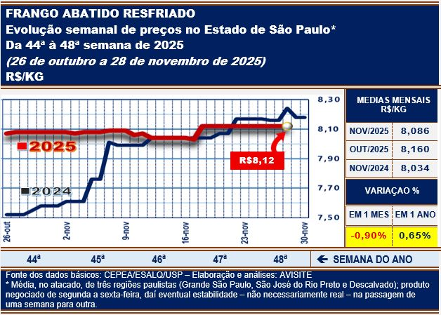 Na semana que passou – quarta e última do mês de novembro – prevaleceu, sem qualquer alteração, a estabilidade absoluta vinda da semana anterior (R$8,12/kg). Mas, com isso, os preços do período ficaram abaixo dos registrados um ano atrás, ocasião em que a média semanal girou em torno dos R$8,18/kg, com pico de R$8,24/kg no final do mês. Daí uma média semanal 0,73% inferior à da mesma semana de 2024.