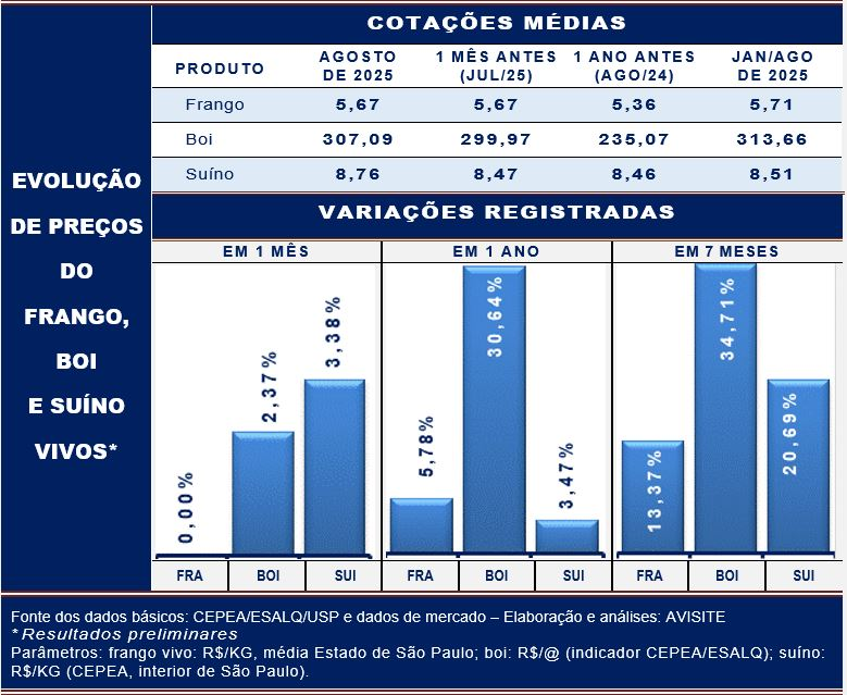 Os ganhos do suíno, no entanto, não são desprezíveis, visto que a média de 2025 se encontra mais de 20% acima da registrada nos oito primeiros meses do ano passado. Assim, o menor ganho fica circunscrito ao frango, visto que sua valorização no ano não vai além de 13%.