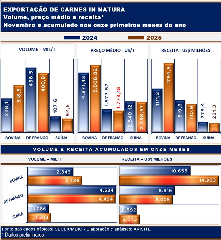 A despeito de desfrutar de melhores perspectivas, a carne de frango ainda não conseguiu reverter o quadro negativo que vem marcando suas exportações desde o episódio de IAAP na avicultura comercial. Fechou novembro com volume mais de 8% menor que o de um ano antes, desempenho acompanhado de uma redução de 5,6% no preço médio. Disso resultou uma receita mais de 13% inferior à de novembro de 2024.
