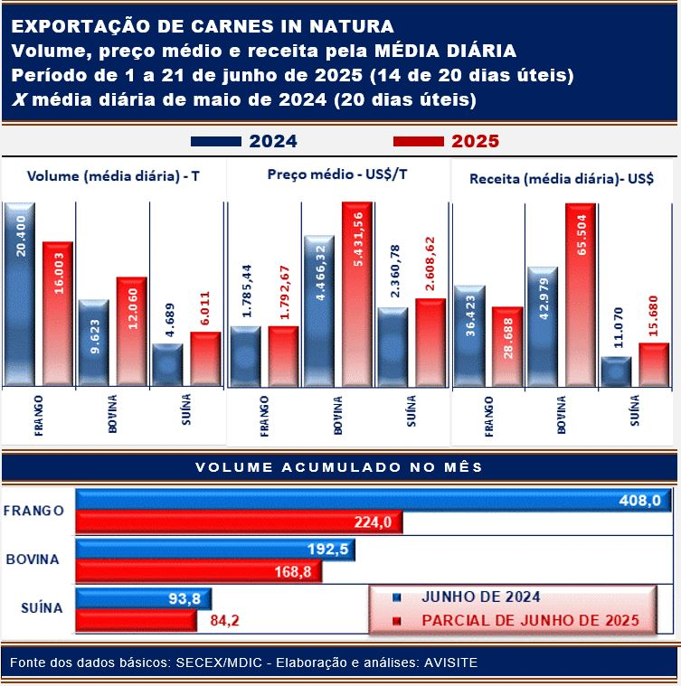 No tocante à receita, a carne bovina já superou (em quase 7%) o que foi auferido um ano atrás, enquanto a receita da carne suína praticamente se iguala à de junho de 2024. Já a receita da carne de frango corresponde a 55% do auferido há um ano, neste mês.