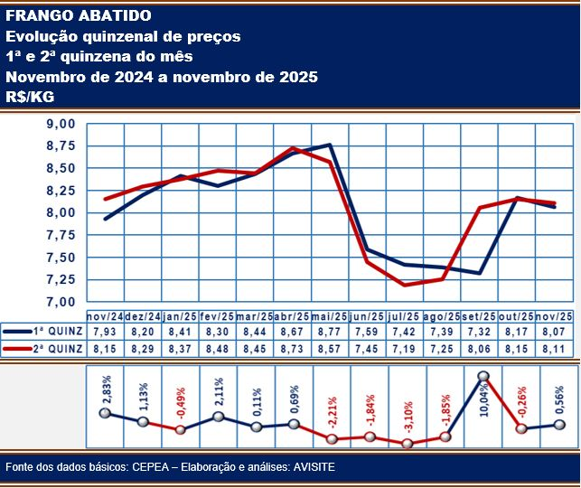 A diferença registrada em novembro foi mínima: apenas meio por cento a mais. Porém, pela quinta vez neste ano, o preço alcançado pelo frango abatido resfriado na 2ª quinzena superou o da metade inicial do mês.
