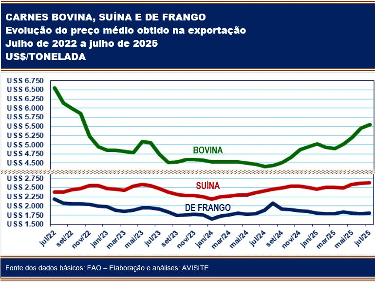 Curiosamente, a carne bovina – que não enfrentou entraves do gênero da carne de frango e que ultimamente vem registrando continua e forte valorização – também iniciou o 2º semestre de 2025 registrando preço inferior ao alcançado há três anos. E com diferença a menos não muito diferente da experimentada pelo frango, pois seu preço mais recente – US$5.545,51/tonelada – ainda se encontra 15,3% aquém dos US$6.549,00/tonelada apontados pela FAO para julho de 2022.