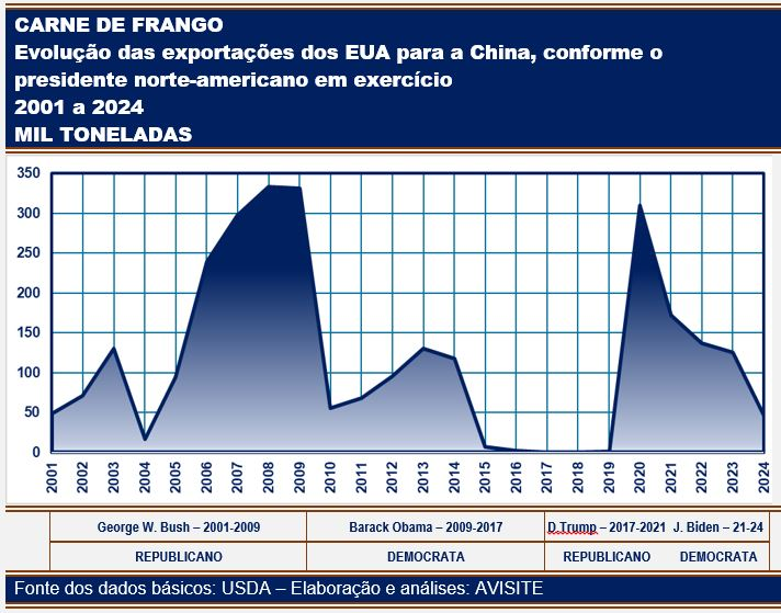 Em 2001, quando o Democrata Bill Clinton transmitiu o bastão ao Republicano George W. Bush (2001/2009), as exportações de carne do frango dos EUA para a China não chegavam às 50 mil toneladas; no finalzinho do governo Bush (2008/2009) haviam aumentado quase 600%, aproximando-se das 350 mil toneladas.