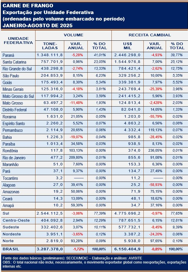 Os números da SECEX/MDIC relativos às exportações de carne de frango dos oito primeiros meses de 2025 mostram que o maior efeito do embargo decorrente do caso de IAAP na avicultura comercial continua recaindo sobre a Região Sul.