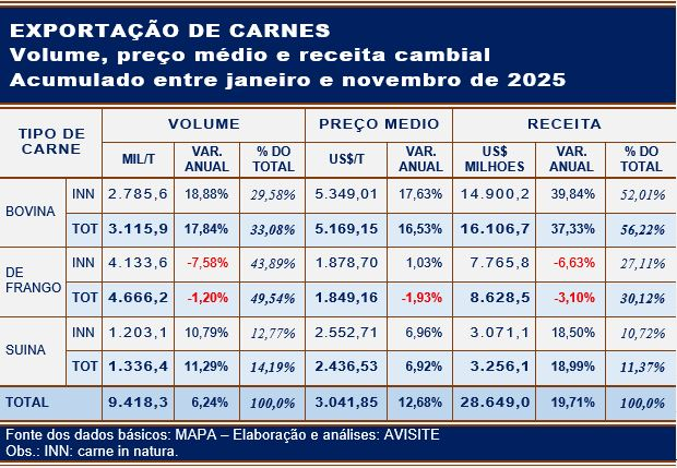 Dados compilados pelo MAPA junto à SECEX/MDIC apontam que nos 11 primeiros meses de 2025 o Brasil exportou volume de carnes pouco mais de 6% superior ao de idêntico período de 2024, mas gerador de uma receita cambial perto de um quinto maior.