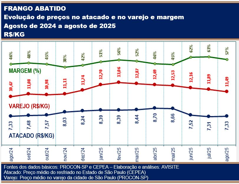 Dados do Procon-SP apontam que em agosto passado o frango resfriado foi comercializado na cidade de São Paulo por R$11,49/kg, menor valor dos últimos nove meses, ou seja, desde dezembro de 2024. Ainda assim, em relação ao mesmo mês do ano passado, prevaleceu alta de, aproximadamente, 7,7%, índice superior à inflação acumulada no período (IPCA), de 5,13%.