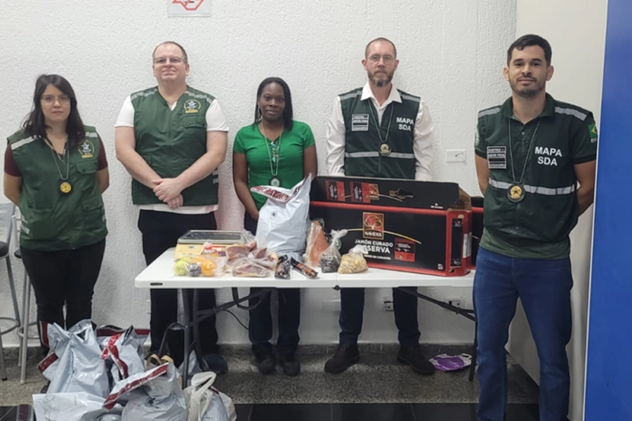Produtos de interesse agropecuário foram apreendidos no Porto de Santos (SP) pela equipe da Vigilância Agropecuária Internacional (Vigiagro). Presunto pata negra, bacalhau, diversos embutidos suínos, frutas frescas, castanhas, mel e outros itens tiveram a entrada no país barrada por servidores do Ministério da Agricultura e Pecuária (Mapa). O total apreendido chegou a 43,78 quilos.