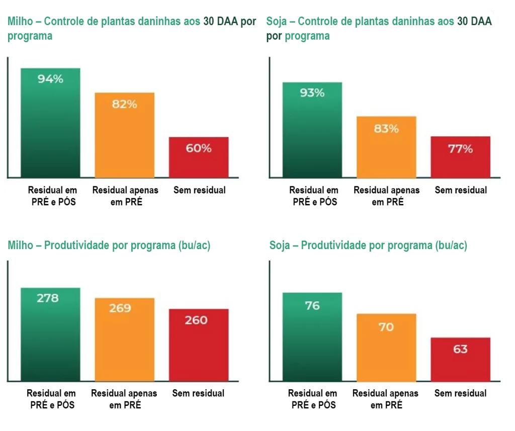Como esperado, o tratamento sem aplicação residual apresentou os piores resultados tanto no controle de plantas daninhas quanto na produtividade das culturas.