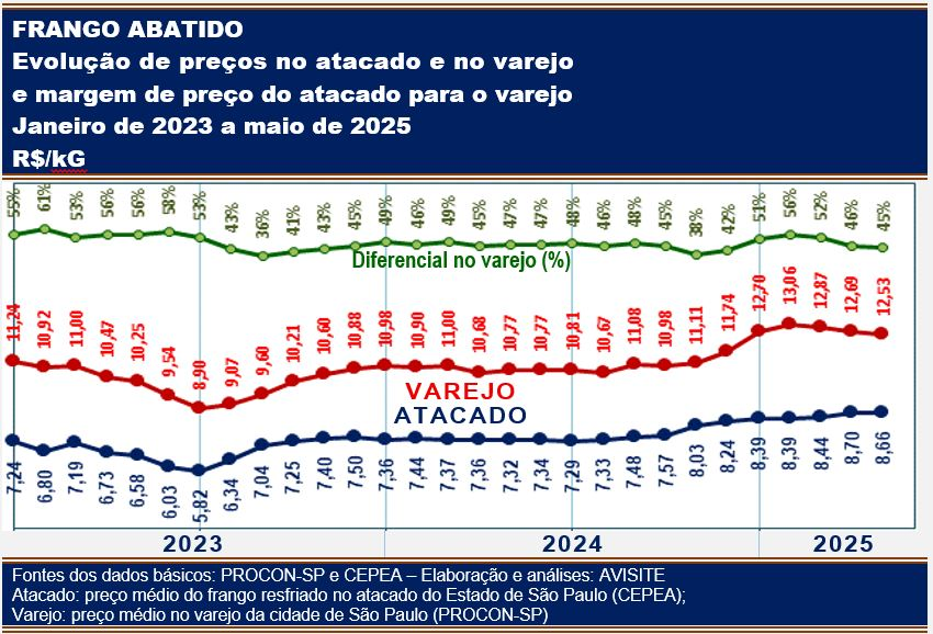 Confrontados com os dados do CEPEA (atacado), os indicadores do PROCON-SP relativos aos preços do frango no varejo da cidade de São Paulo apontam que, entre janeiro e maio de 2025 a margem de preço entre os dois segmentos foi, em média, de 50%. Como nos mesmos cinco meses do ano passado essa margem ficou próxima dos 47,5%, o aumento neste ano situa-se em torno dos 5,5%. De toda forma, os índices de 2024 e 2025 são bem menores que o de dois anos atrás (janeiro a maio de 2023), quando a margem registrada superou os 56%.