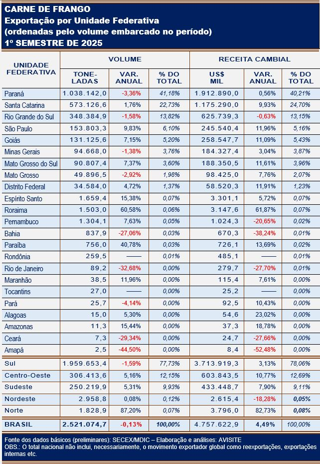 Entre essas 23 UFs, nove delas completaram a primeira metade de 2025 registrando retração no volume embarcado, quatro delas (Paraná, Rio Grande do Sul, Minas Gerais e Mato Grosso) por força do embargo decorrente do caso de IAAP na avicultura comercial. Neste caso, a maior redução – tanto em valores absolutos como relativos – recaiu sobre o Paraná, maior exportador brasileiro.