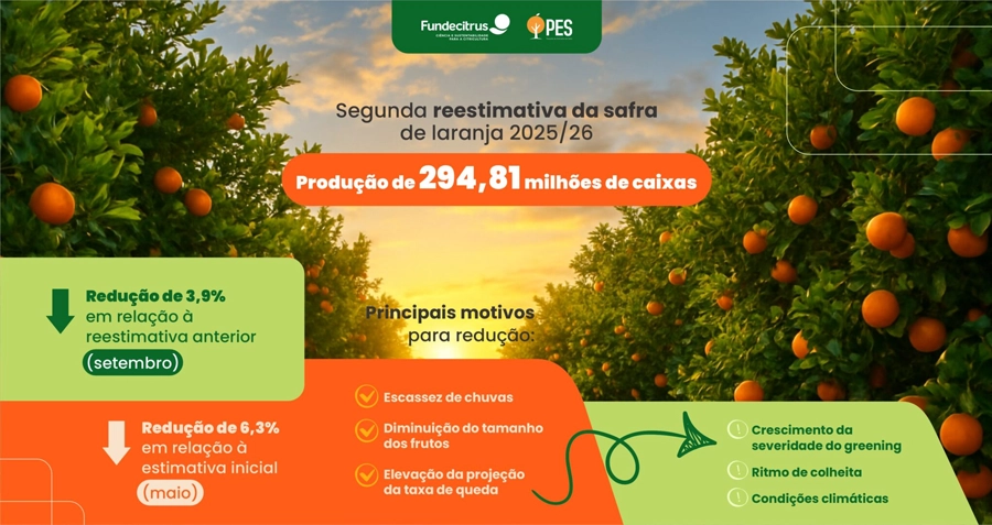 A segunda reestimativa da safra de laranja 2025/26 do cinturão citrícola de São Paulo e Triângulo/Sudoeste Mineiro, divulgada pelo Fundecitrus nesta quarta-feira (10/12), indica produção de 294,81 milhões de caixas de laranja de 40,8 kg, redução de 3,9% em relação à primeira reestimativa da safra, divulgada em 10/9, que apontava produção de 306,74 milhões de caixas, e de 6,3% em relação à estimativa do dia 10 de maio, que apontava produção de 314,60 milhões de caixas.